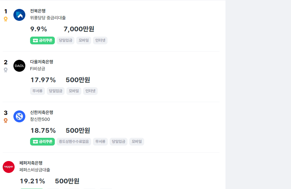 2금융권은 금리조건이 좋지 않기 때문에 추천드리는 않습니다. 하지만 정말 대출이 필요한 상황이면 잠깐 생각해보실 수는 있습니다. 뱅크샐러드 홈페이지(링크)의 관련 내용을 참고하세요.