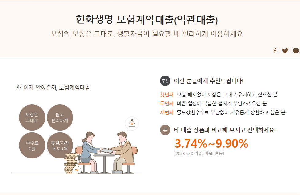 대출 금리: 보험상품별 상이, 3.74%~9.90% (2023.4.30 기준, 매월 변동)