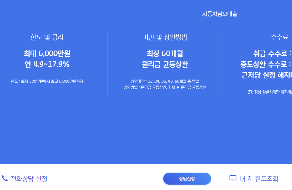 자동차를 담보로 대출받기 때문에 무직자도 자동차만 있으면 꽤 많은 금액의 대출을 좋은 조건으로 받을수 있습니다. 아래는 현대캐피탈 자동차 담보대출을 기준으로 합니다.